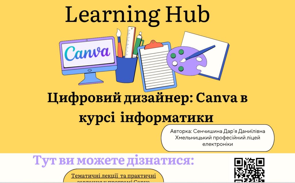 Сенчишина Дар’я Даниїлівна, викладачка Хмельницького професійного ліцею електроніки, – Learning Hub – Цифровий дизайнер: Canva в курсі інформатики (диплом ІІІ ступеня);