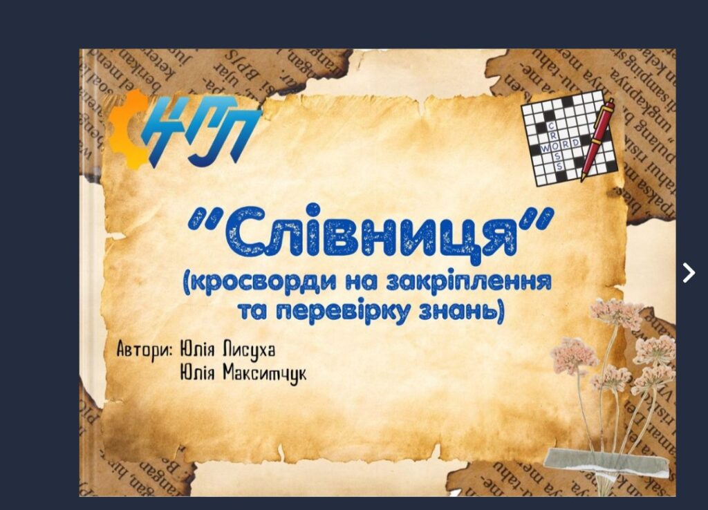 Лисуха Юлія Андріївна, Юлія Максимчук, викладачки Нетішинського професійного ліцею, – електронний посібник “Слівниця” (кросворди на закріплення та перевірку знань) (диплом ІІІ ступеня);
