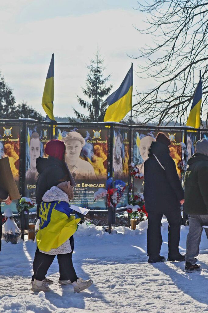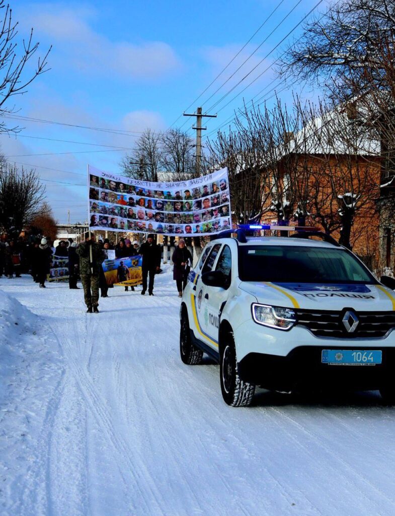 Сьогодні, 16 лютого, в День єднання працівники ДНЗ “Полонський агропромисловий центр професійної освіти” взяли участь у відкритті стіни надії “Віра сильніша за тишу”. Для нас це не просто сорок фото Захисників, а чотири десятки людських життів, доля яких невідома. Серце стискається за кожного, адже серед них є наші випускники, друзі, знайомі, сусіди, односельці. Потім небайдужі жителі громади мирною ходою пройшли центральною вулицею селища разом із рідними захисників, які пропали безвісти, до Алеї загиблих воїнів. Портрети зниклих воїнів супроводжував жовто-блакитний стяг–прапор країни, за яку боряться Захисники, та чорно-білий прапор віри й надії, який символічно нагадував присутнім, що зниклі воїни не забуті, про них пам’ятають.